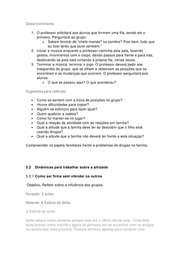 23. 23. Desenvolvimento: 1. O professor solicitará aos alunos que formem uma fila, sendo ele o  primeiro. Perguntará ao grupo:  o Sabem brincar de "chefe manda? ou sombra? Pois bem, tudo que  eu fizer terão que fazer também."  2. Iniciar a música enquanto o professor caminha pela sala, fazendo  gestos, movimentos com o corpo, dando passos para frente e para trás,  deslocando­se pela sala cortando a própria fila, várias vezes.  3. Terminar a música, terminar o jogo. O professor deverá pedir aos  integrantes do grupo, que se olhem e observem as posições que se  encontram e as mudanças que ocorrem. O professor perguntará aos  alunos:  o O que se passou aqui? O que aconteceu? Sugestões para reflexão: • Como se sentem com a troca de posições no grupo?  • Houve dificuldades para copiar?  • Alguém se esforçou para fazer igual?  • Quem quebrou a cadeia?  • Como foi manter­se no lugar?  • Qual a relação da atividade com as relações em família?  • Qual a atitude que a família deve ter ao descobrir que o filho está  usando drogas?  • Qual a atitude que a família não deverá ter frente a esta situação? Compreender os papéis familiares frente a problemas de drogas na família.  5.2    Dinâmicas para trabalhar sobre a amizade5.2.1 Como ser firme sem ofender os outros Objetivo: Refletir sobre a influência dos grupos. Duração: 2 aulas. Material: A Estória de Sofia.A Estória de SofiaSofia estava muito contente porque hoje era o último dia de aula. Tinha feito duas provas nesta manhã e agora só pensava em se encontrar com os amigos na lanchonete mais próxima. Possuía dinheiro apenas para comprar uma