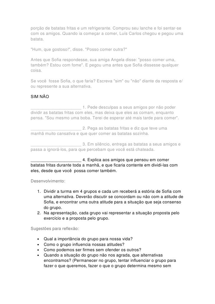 24. 24. porção de batatas fritas e um refrigerante. Comprou seu lanche e foi sentar­se com os amigos. Quando ia começar a comer, Luís Carlos chegou e pegou uma batata. "Hum, que gostoso!", disse. "Posso comer outra?" Antes que Sofia respondesse, sua amiga Angela disse: "posso comer uma, também? Estou com fome". E pegou uma antes que Sofia dissesse qualquer coisa. Se você  fosse Sofia, o que faria? Escreva "sim" ou "não" diante da resposta e/ou represente a sua alternativa. SIM NÃO _____________________ 1. Pede desculpas a seus amigos por não poder dividir as batatas fritas com eles, mas deixa que eles as comam, enquanto pensa. "Sou mesmo uma boba. Terei de esperar até mais tarde para comer". _____________________ 2. Pega as batatas fritas e diz que teve uma manhã muito cansativa e que quer comer as batatas sozinha. _____________________ 3. Em silêncio, entrega as batatas a seus amigos e passa a ignorá­los, para que percebam que você está chateada. _____________________ 4. Explica aos amigos que pensou em comer batatas fritas durante toda a manhã, e que ficaria contente em dividi­las com eles, desde que você  possa comer também.Desenvolvimento:  1. Dividir a turma em 4 grupos e cada um receberá a estória de Sofia com  uma alternativa. Deverão discutir se concordam ou não com a atitude de  Sofia, e encontrar uma outra atitude para a situação que seja consenso  do grupo.  2. Na apresentação, cada grupo vai representar a situação proposta pelo  exercício e a proposta pelo grupo. Sugestões para reflexão:  • Qual a importância do grupo para nossa vida?  • Como o grupo influencia nossas atitudes?  • Como podemos ser firmes sem ofender os outros?  • Quando a situação do grupo não nos agrada, que alternativas  encontramos? (Permanecer no grupo, tentar influenciar o grupo para  fazer o que queremos, fazer o que o grupo determina mesmo sem