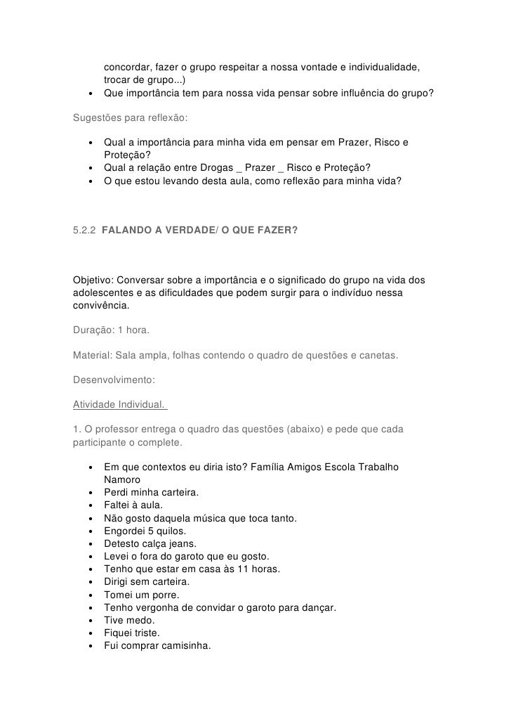 25. 25. concordar, fazer o grupo respeitar a nossa vontade e individualidade,  trocar de grupo...)  • Que importância tem para nossa vida pensar sobre influência do grupo? Sugestões para reflexão: • Qual a importância para minha vida em pensar em Prazer, Risco e  Proteção?  • Qual a relação entre Drogas _ Prazer _ Risco e Proteção?  • O que estou levando desta aula, como reflexão para minha vida? 5.2.2  FALANDO A VERDADE/ O QUE FAZER? Objetivo: Conversar sobre a importância e o significado do grupo na vida dos adolescentes e as dificuldades que podem surgir para o indivíduo nessa convivência. Duração: 1 hora. Material: Sala ampla, folhas contendo o quadro de questões e canetas. Desenvolvimento: Atividade Individual. 1. O professor entrega o quadro das questões (abaixo) e pede que cada participante o complete.  • Em que contextos eu diria isto? Família Amigos Escola Trabalho  Namoro  • Perdi minha carteira.  • Faltei à aula.  • Não gosto daquela música que toca tanto.  • Engordei 5 quilos.  • Detesto calça jeans.  • Levei o fora do garoto que eu gosto.  • Tenho que estar em casa às 11 horas.  • Dirigi sem carteira.  • Tomei um porre.  • Tenho vergonha de convidar o garoto para dançar.  • Tive medo.  • Fiquei triste.  • Fui comprar camisinha.