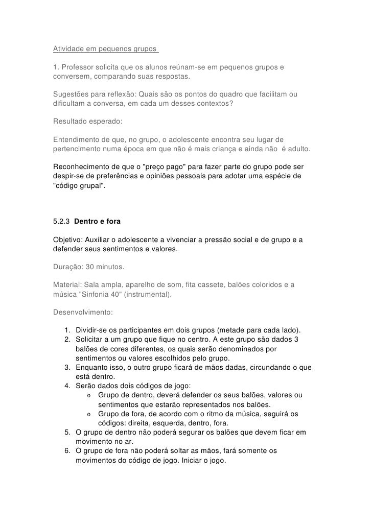26. 26. Atividade em pequenos grupos 1. Professor solicita que os alunos reúnam­se em pequenos grupos e conversem, comparando suas respostas. Sugestões para reflexão: Quais são os pontos do quadro que facilitam ou dificultam a conversa, em cada um desses contextos? Resultado esperado: Entendimento de que, no grupo, o adolescente encontra seu lugar de pertencimento numa época em que não é mais criança e ainda não  é adulto. Reconhecimento de que o "preço pago" para fazer parte do grupo pode ser despir­se de preferências e opiniões pessoais para adotar uma espécie de "código grupal". 5.2.3  Dentro e foraObjetivo: Auxiliar o adolescente a vivenciar a pressão social e de grupo e a defender seus sentimentos e valores. Duração: 30 minutos.Material: Sala ampla, aparelho de som, fita cassete, balões coloridos e a música "Sinfonia 40" (instrumental).Desenvolvimento: 1. Dividir­se os participantes em dois grupos (metade para cada lado).  2. Solicitar a um grupo que fique no centro. A este grupo são dados 3  balões de cores diferentes, os quais serão denominados por  sentimentos ou valores escolhidos pelo grupo.  3. Enquanto isso, o outro grupo ficará de mãos dadas, circundando o que  está dentro.  4. Serão dados dois códigos de jogo:  o Grupo de dentro, deverá defender os seus balões, valores ou  sentimentos que estarão representados nos balões.  o Grupo de fora, de acordo com o ritmo da música, seguirá os  códigos: direita, esquerda, dentro, fora.  5. O grupo de dentro não poderá segurar os balões que devem ficar em  movimento no ar.  6. O grupo de fora não poderá soltar as mãos, fará somente os  movimentos do código de jogo. Iniciar o jogo.