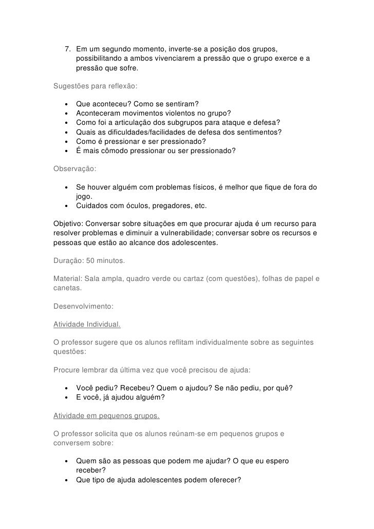 27. 27. 7. Em um segundo momento, inverte­se a posição dos grupos,  possibilitando a ambos vivenciarem a pressão que o grupo exerce e a  pressão que sofre. Sugestões para reflexão: • Que aconteceu? Como se sentiram?  • Aconteceram movimentos violentos no grupo?  • Como foi a articulação dos subgrupos para ataque e defesa?  • Quais as dificuldades/facilidades de defesa dos sentimentos?  • Como é pressionar e ser pressionado?  • É mais cômodo pressionar ou ser pressionado? Observação: • Se houver alguém com problemas físicos, é melhor que fique de fora do  jogo.  • Cuidados com óculos, pregadores, etc. Objetivo: Conversar sobre situações em que procurar ajuda é um recurso para resolver problemas e diminuir a vulnerabilidade; conversar sobre os recursos e pessoas que estão ao alcance dos adolescentes. Duração: 50 minutos.Material: Sala ampla, quadro verde ou cartaz (com questões), folhas de papel e canetas.Desenvolvimento:Atividade Individual.O professor sugere que os alunos reflitam individualmente sobre as seguintes questões:Procure lembrar da última vez que você precisou de ajuda: • Você pediu? Recebeu? Quem o ajudou? Se não pediu, por quê?  • E você, já ajudou alguém? Atividade em pequenos grupos.O professor solicita que os alunos reúnam­se em pequenos grupos e conversem sobre: • Quem são as pessoas que podem me ajudar? O que eu espero  receber?  • Que tipo de ajuda adolescentes podem oferecer?