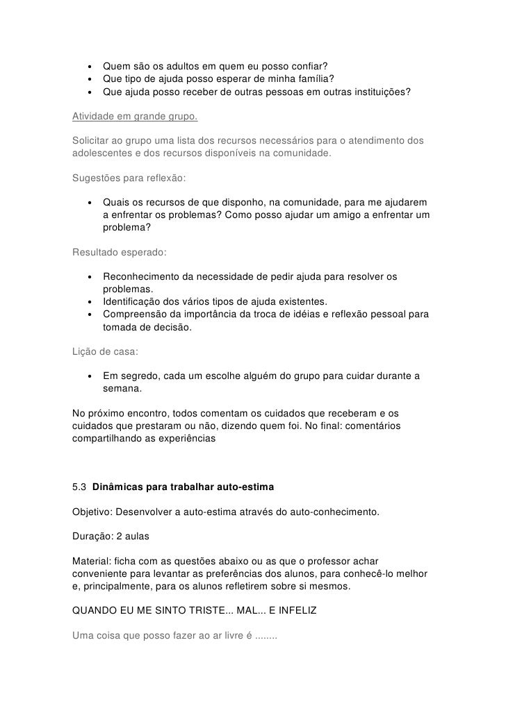 28. 28. • Quem são os adultos em quem eu posso confiar?  • Que tipo de ajuda posso esperar de minha família?  • Que ajuda posso receber de outras pessoas em outras instituições? Atividade em grande grupo.Solicitar ao grupo uma lista dos recursos necessários para o atendimento dos adolescentes e dos recursos disponíveis na comunidade.Sugestões para reflexão: • Quais os recursos de que disponho, na comunidade, para me ajudarem  a enfrentar os problemas? Como posso ajudar um amigo a enfrentar um  problema? Resultado esperado: • Reconhecimento da necessidade de pedir ajuda para resolver os  problemas.  • Identificação dos vários tipos de ajuda existentes.  • Compreensão da importância da troca de idéias e reflexão pessoal para  tomada de decisão. Lição de casa: • Em segredo, cada um escolhe alguém do grupo para cuidar durante a  semana. No próximo encontro, todos comentam os cuidados que receberam e os cuidados que prestaram ou não, dizendo quem foi. No final: comentários compartilhando as experiências 5.3  Dinâmicas para trabalhar auto­estimaObjetivo: Desenvolver a auto­estima através do auto­conhecimento.Duração: 2 aulasMaterial: ficha com as questões abaixo ou as que o professor achar conveniente para levantar as preferências dos alunos, para conhecê­lo melhor e, principalmente, para os alunos refletirem sobre si mesmos.QUANDO EU ME SINTO TRISTE... MAL... E INFELIZ Uma coisa que posso fazer ao ar livre é ........