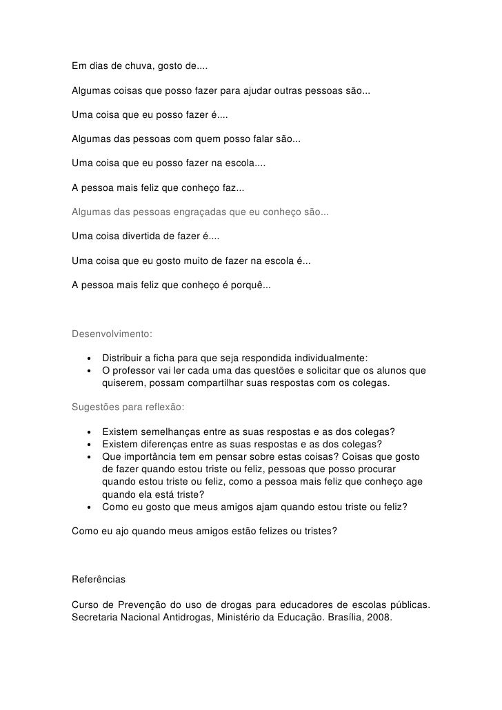 29. 29. Em dias de chuva, gosto de....Algumas coisas que posso fazer para ajudar outras pessoas são...Uma coisa que eu posso fazer é....Algumas das pessoas com quem posso falar são...Uma coisa que eu posso fazer na escola....A pessoa mais feliz que conheço faz... Algumas das pessoas engraçadas que eu conheço são...Uma coisa divertida de fazer é....Uma coisa que eu gosto muito de fazer na escola é...A pessoa mais feliz que conheço é porquê...Desenvolvimento:  • Distribuir a ficha para que seja respondida individualmente:  • O professor vai ler cada uma das questões e solicitar que os alunos que  quiserem, possam compartilhar suas respostas com os colegas. Sugestões para reflexão:  • Existem semelhanças entre as suas respostas e as dos colegas?  • Existem diferenças entre as suas respostas e as dos colegas?  • Que importância tem em pensar sobre estas coisas? Coisas que gosto  de fazer quando estou triste ou feliz, pessoas que posso procurar  quando estou triste ou feliz, como a pessoa mais feliz que conheço age  quando ela está triste?  • Como eu gosto que meus amigos ajam quando estou triste ou feliz? Como eu ajo quando meus amigos estão felizes ou tristes?ReferênciasCurso de Prevenção do uso de drogas para educadores de escolas públicas. Secretaria Nacional Antidrogas, Ministério da Educação. Brasília, 2008.