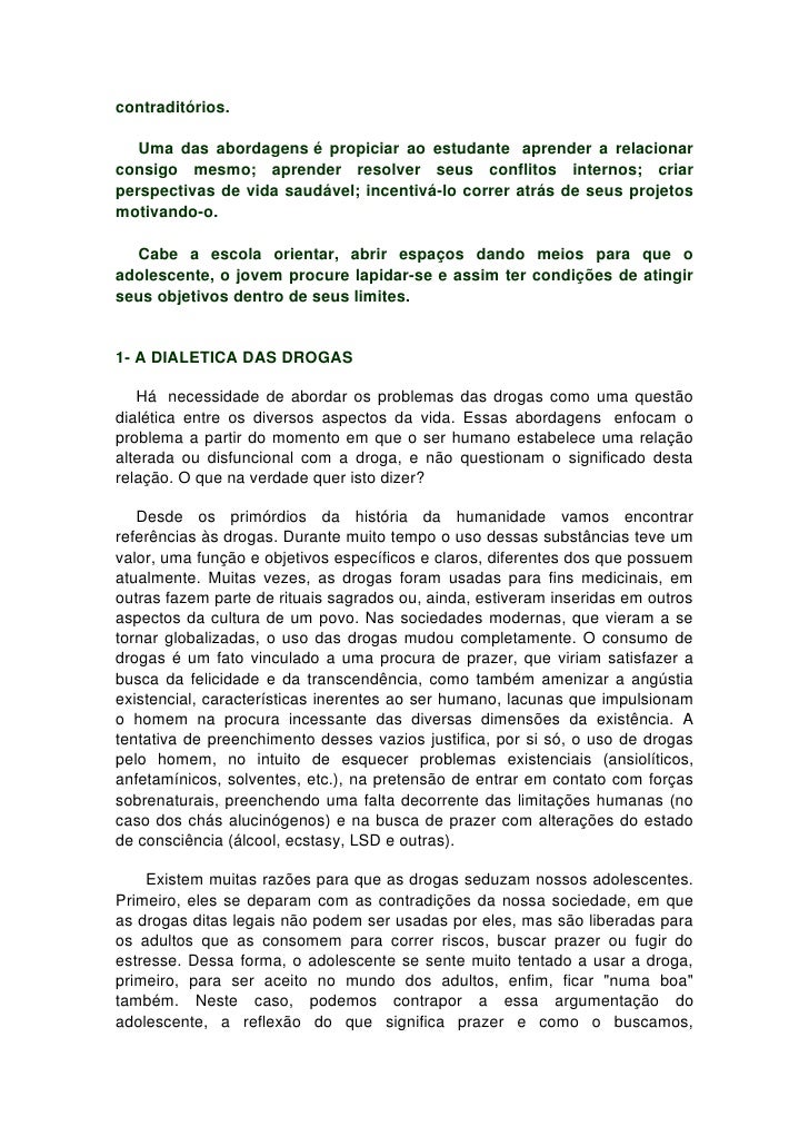 3. 3. contraditórios.        Uma das abordagens é propiciar ao estudante   aprender a relacionar consigo   mesmo;   aprender   resolver   seus   conflitos   internos;   criar perspectivas de vida saudável; incentivá­lo correr atrás de seus projetos motivando­o.        Cabe   a   escola   orientar,   abrir   espaços   dando   meios   para   que   o adolescente, o jovem procure lapidar­se e assim ter condições de atingir seus objetivos dentro de seus limites.       1­ A DIALETICA DAS DROGAS     Há   necessidade de abordar os problemas das drogas como uma questão dialética  entre  os diversos  aspectos da  vida.  Essas abordagens   enfocam o problema a partir do momento em que o ser humano estabelece uma relação alterada ou disfuncional com a droga, e não questionam o significado desta relação. O que na verdade quer isto dizer?      Desde   os   primórdios   da   história   da   humanidade   vamos   encontrar referências às drogas. Durante muito tempo o uso dessas substâncias teve um valor, uma função e objetivos específicos e claros, diferentes dos que possuem atualmente. Muitas vezes, as drogas foram usadas para fins medicinais, em outras fazem parte de rituais sagrados ou, ainda, estiveram inseridas em outros aspectos da cultura de um povo. Nas sociedades modernas, que vieram a se tornar globalizadas, o uso das drogas mudou completamente. O consumo de drogas é um fato vinculado a uma procura de prazer, que viriam satisfazer a busca da felicidade e da transcendência, como também amenizar a angústia existencial, características inerentes ao ser humano, lacunas que impulsionam o   homem   na   procura   incessante   das   diversas   dimensões   da   existência.   A tentativa de preenchimento desses vazios justifica, por si só, o uso de drogas pelo   homem,   no   intuito   de   esquecer   problemas   existenciais   (ansiolíticos, anfetamínicos, solventes, etc.), na pretensão de entrar em contato com forças sobrenaturais, preenchendo uma falta decorrente das limitações humanas (no caso dos chás alucinógenos) e na busca de prazer com alterações do estado de consciência (álcool, ecstasy, LSD e outras).       Existem muitas razões para que as drogas seduzam nossos adolescentes. Primeiro, eles se deparam com as contradições da nossa sociedade, em que as drogas ditas legais não podem ser usadas por eles, mas são liberadas para os   adultos   que   as   consomem   para   correr   riscos,   buscar   prazer   ou   fugir   do estresse. Dessa forma, o adolescente se sente muito tentado a usar a droga, primeiro,   para   ser   aceito   no   mundo   dos   adultos,   enfim,   ficar   "numa   boa" também.   Neste   caso,   podemos   contrapor   a   essa   argumentação   do adolescente,   a   reflexão   do   que   significa   prazer   e   como   o   buscamos,