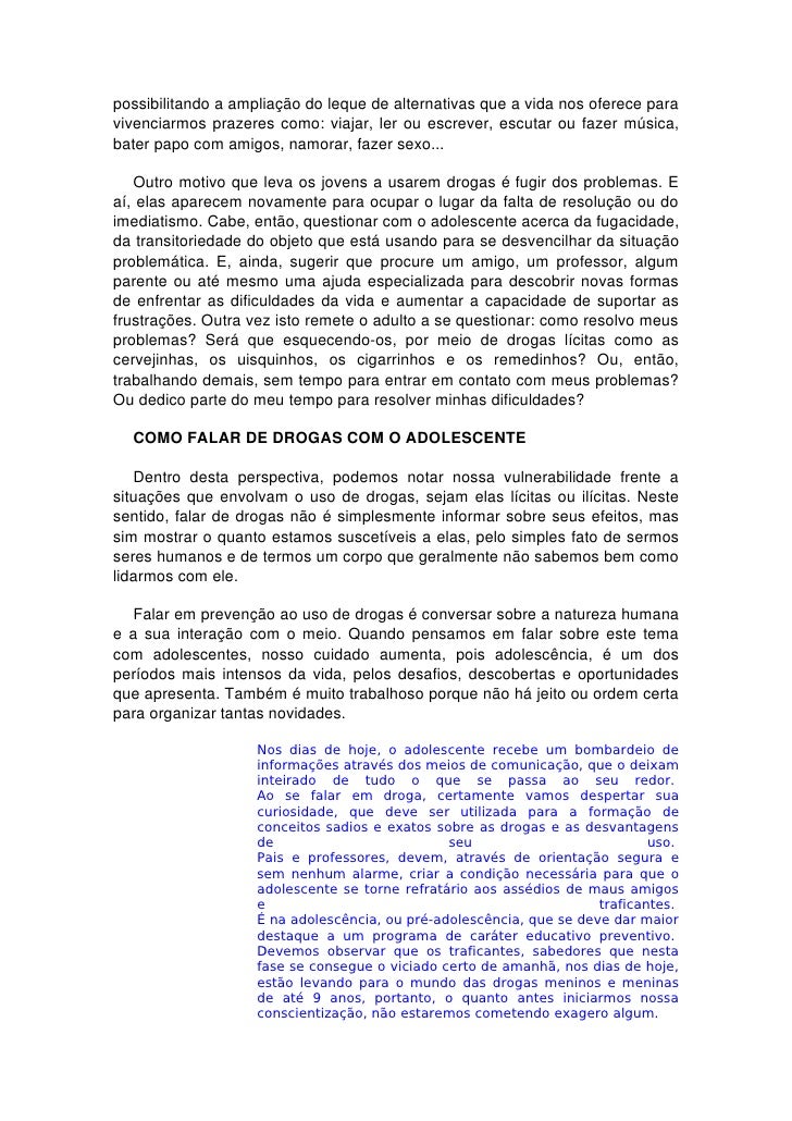 4. 4. possibilitando a ampliação do leque de alternativas que a vida nos oferece para vivenciarmos prazeres como: viajar, ler ou escrever, escutar ou fazer música, bater papo com amigos, namorar, fazer sexo...       Outro motivo que leva os jovens a usarem drogas é fugir dos problemas. E aí, elas aparecem novamente para ocupar o lugar da falta de resolução ou do imediatismo. Cabe, então, questionar com o adolescente acerca da fugacidade, da transitoriedade do objeto que está usando para se desvencilhar da situação problemática. E, ainda, sugerir que procure um amigo, um professor, algum parente ou até mesmo uma ajuda especializada para descobrir novas formas de enfrentar as dificuldades da vida e aumentar a capacidade de suportar as frustrações. Outra vez isto remete o adulto a se questionar: como resolvo meus problemas?   Será   que   esquecendo­os,   por   meio   de   drogas   lícitas   como   as cervejinhas,   os   uisquinhos,   os   cigarrinhos   e   os   remedinhos?   Ou,   então, trabalhando demais, sem tempo para entrar em contato com meus problemas? Ou dedico parte do meu tempo para resolver minhas dificuldades?     COMO FALAR DE DROGAS COM O ADOLESCENTE     Dentro   desta   perspectiva,   podemos   notar   nossa   vulnerabilidade   frente   a situações que envolvam o uso de drogas, sejam elas lícitas ou ilícitas. Neste sentido, falar de drogas não é simplesmente informar sobre seus efeitos, mas sim mostrar o quanto estamos suscetíveis a elas, pelo simples fato de sermos seres humanos e de termos um corpo que geralmente não sabemos bem como lidarmos com ele.      Falar em prevenção ao uso de drogas é conversar sobre a natureza humana e a sua interação com o meio. Quando pensamos em falar sobre este tema com   adolescentes,   nosso   cuidado   aumenta,   pois   adolescência,   é   um   dos períodos mais intensos da vida, pelos desafios, descobertas e oportunidades que apresenta. Também é muito trabalhoso porque não há jeito ou ordem certa para organizar tantas novidades. Nos dias de hoje, o adolescente recebe um bombardeio de informações através dos meios de comunicação, que o deixam inteirado de tudo o que se passa ao seu redor. Ao se falar em droga, certamente vamos despertar sua curiosidade, que deve ser utilizada para a formação de conceitos sadios e exatos sobre as drogas e as desvantagens de seu uso. Pais e professores, devem, através de orientação segura e sem nenhum alarme, criar a condição necessária para que o adolescente se torne refratário aos assédios de maus amigos e traficantes. É na adolescência, ou pré-adolescência, que se deve dar maior destaque a um programa de caráter educativo preventivo. Devemos observar que os traficantes, sabedores que nesta fase se consegue o viciado certo de amanhã, nos dias de hoje, estão levando para o mundo das drogas meninos e meninas de até 9 anos, portanto, o quanto antes iniciarmos nossa conscientização, não estaremos cometendo exagero algum.
