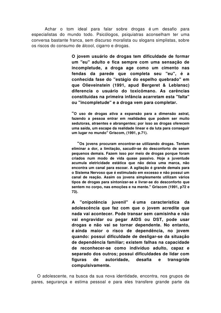 5. 5. Achar   o   tom   ideal   para   falar   sobre   drogas   é um   desafio   para especialistas   do   mundo   todo.   Psicólogos,   psiquiatras   aconselham   ter   uma conversa bastante franca, sem discurso moralista ou slogans simplistas, sobre os riscos do consumo de álcool, cigarro e drogas.   O jovem usuário de drogas tem dificuldade de formar  um "eu" adulto e fica sempre com uma sensação de  incompletude,   a   droga   age   como   um   cimento   nas  fendas   da   parede   que   completa   seu   "eu",   é   a  conhecida fase do "estágio do espelho quebrado" em  que   Olieveinstein   (1991,   apud   Bergeret   &   Leblansc)  diferencia   o   usuário   do   toxicômano.   As   carências  constituídas na primeira infância acarretam esta "falta"  ou "incompletude" e a droga vem para completar. "O   uso   de   drogas   ativa   a   expansão   para   a   dimensão   astral,  fazendo   a   pessoa   entrar   em   realidades   que   podem   ser   muito  sedutoras, atraentes e abrangentes; por isso as drogas oferecem  uma saída, um escape da realidade linear e da luta para conseguir  um lugar no mundo" Griscom, (1991, p.71).      "Os jovens procuram encontrar­se utilizando drogas. Tentam  eliminar a dor, a limitação, sacudir­se do desconforto de serem  pequenos demais. Fazem isso por meio de drogas porque foram  criados   num   modo   de   vida   quase   passivo.   Hoje   a   juventude  acumula   eletricidade   estática   que   não   deixa   uma   marca,   não  encontra um canal para escoar. A agitação é grande demais para  o Sistema Nervoso que é estimulado em excesso e não possui um  canal   de   reação.  Assim   os   jovens   simplesmente  utilizam   vários  tipos de drogas para sintonizar­se e livrar­se do desconforto que  sentem no corpo, nas emoções e na mente." Griscom (1991, p72 e  73).  A   "onipotência   juvenil"   é uma   característica   da  adolescência   que   faz   com   que   o   jovem   acredite   que  nada vai acontecer. Pode transar sem camisinha e não  vai   engravidar   ou   pegar   AIDS   ou   DST,   pode   usar  drogas   e   não   vai   se   tornar   dependente.   No   entanto,  é ainda   maior   o   risco   de   dependência,   no   jovem  quando: possui dificuldade de desligar­se da situação  de dependência familiar; existem falhas na capacidade  de   reconhecer­se   como   indivíduo   adulto,   capaz   e  separado dos outros; possui dificuldades de lidar com  figuras   de   autoridade,   desafia   e   transgride  compulsivamente.      O adolescente, na busca da sua nova identidade, encontra, nos grupos de pares,   segurança   e   estima   pessoal   e   para   eles   transfere   grande   parte   da