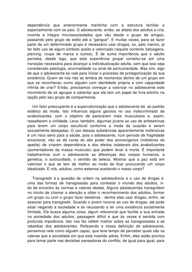 6. 6. dependência   que   anteriormente   mantinha   com   a   estrutura   familiar   e especialmente com os pais. O adolescente, então, se afasta dos adultos e cria, inventa   e   integra   microssociedades   que   vão   desde   o   grupo   de   amigos, passando pelo grupo de estilo até a "gangue". E muitas vezes, para se fazer parte de um determinado grupo é necessário usar drogas, ou, pelo menos, já ter feito uso de algum símbolo aceito e valorizado naquele contexto (tatuagens, piercing,   roupa   de   marca   e   outros).   É   de   suma   importância   que   o   adulto perceba,   desde   logo,   que   esta   experiência   grupal   constitui­se   em   uma transição necessária para alcançar a individualização adulta, sem que isso seja considerado patologia, anormalidade ou sinal de periculosidade. Mas sim, algo de que o adolescente se vale para iniciar o processo de protagonização da sua existência. Quem de nós não se lembra de momentos dentro de um grupo em que se reconheceu como alguém com identidade própria e com capacidade infinita de criar? Então, precisamos começar a valorizar no adolescente este movimento de se agrupar e salientar que ele tem um papel de livre­arbítrio na opção pelo seu grupo de companheiros.     Um fator preocupante é a supervalorização que o adolescente dá  ao padrão estético   da   moda.   Isto   influencia   alguns   garotos   no   uso   indiscriminado   de anabolizantes,   com   o   objetivo   de   parecerem   mais   musculosos   e,   assim, ressaltarem a virilidade. Leva, também, algumas jovens ao uso de anfetaminas para   terem   um   corpo   escultural   conforme   a   moda   da   ocasião   e   serem sexualmente desejadas. O uso dessas substâncias aparentemente inofensivas é um risco sério para a saúde, pois o adolescente, num período de fragilidade emocional,   não   se   dá   conta   do   alto   poder   dos   anorexígenos   (inibidores   do apetite)   de   criarem   dependência   e   dos   efeitos   colaterais   dos   anabolizantes (aumentadores da massa muscular) que podem levar à morte. É importante trabalharmos   com   o   adolescente   as   diferenças   dos   corpos   humanos,   a genética,   o   autocuidado,   o   sentido   de   beleza.   Mostrar   que   a   paz   está   em valorizar   o   que   se   tem   de   melhor   ao   invés   de   ficar   procurando   um   corpo idealizado. E nós, adultos, como estamos aceitando o nosso corpo?     Transgredir é a questão de ordem na adolescência e o uso de drogas é  uma   das   formas   de   transgressão   para   contestar   o   mundo   dos   adultos,   in do de encontro às normas e valores destes. Alguns adolescentes transgridem no intuito de chamar a atenção e obter o reconhecimento dos adultos, formar um grupo ou com o grupo fazer besteiras ­ dentre elas usar drogas; enfim, se associar para transgredir. Quando o jovem recorre ao uso de drogas, ele pode estar negando a sociedade e se recusando a ter uma existência socialmente limitada. Ele busca alguma coisa, algum referencial que facilite a sua entrada na   sociedade   dos   adultos,   passagem   difícil   e   que   às   vezes   é   sentida   com profunda impotência. Isto nos faz refletir melhor sobre as transgressões e as rebeldias   dos   adolescentes.   Refazendo   a   nossa   definição   de   adolescente, pensemos nele como alguém capaz, que teve tempo de perceber quais são os valores que a sociedade em que está inserido adota. Enfim, eles estão prontos para tomar parte nas decisões saneadoras do conflito, de igual para igual, para