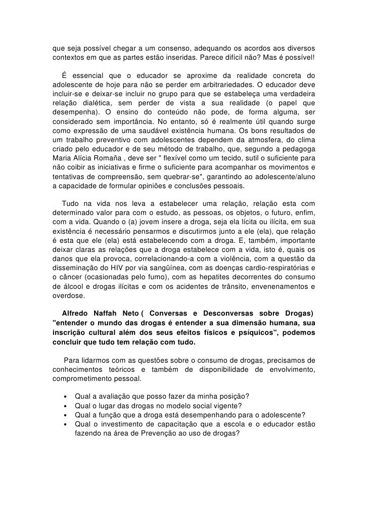 7. 7. que seja possível chegar a um consenso, adequando os acordos aos diversos contextos em que as partes estão inseridas. Parece difícil não? Mas é possível!     É   essencial   que   o   educador   se   aproxime   da   realidade   concreta   do adolescente de hoje para não se perder em arbitrariedades. O educador deve incluir­se e deixar­se incluir no grupo para que se estabeleça uma verdadeira relação   dialética,   sem   perder   de   vista   a   sua   realidade   (o   papel   que desempenha).   O   ensino   do   conteúdo   não   pode,   de   forma   alguma,   ser considerado sem importância. No entanto, só é realmente útil quando surge como expressão de uma saudável existência humana. Os bons resultados de um trabalho preventivo com adolescentes dependem da atmosfera, do clima criado pelo educador e de seu método de trabalho, que, segundo a pedagoga Maria Alícia Romaña , deve ser " flexível como um tecido, sutil o suficiente para não coibir as iniciativas e firme o suficiente para acompanhar os movimentos e tentativas de compreensão, sem quebrar­se", garantindo ao adolescente/aluno a capacidade de formular opiniões e conclusões pessoais.     Tudo   na   vida   nos   leva   a   estabelecer   uma   relação,   relação   esta   com determinado valor para com o estudo, as pessoas, os objetos, o futuro, enfim, com a vida. Quando o (a) jovem insere a droga, seja ela lícita ou ilícita, em sua existência é necessário pensarmos e discutirmos junto a ele (ela), que relação é esta que ele (ela) está estabelecendo com a droga. E, também, importante deixar claras as relações que a droga estabelece com a vida, isto é, quais os danos que ela provoca, correlacionando­a com a violência, com a questão da disseminação do HIV por via sangüínea, com as doenças cardio­respiratórias e o câncer (ocasionadas pelo fumo), com as hepatites decorrentes do consumo de álcool e drogas ilícitas e com os acidentes de trânsito, envenenamentos e overdose.     Alfredo   Naffah   Neto (   Conversas   e   Desconversas   sobre   Drogas)  "entender o mundo das drogas é entender a sua dimensão humana, sua inscrição  cultural além  dos   seus  efeitos   físicos  e psíquicos",   podemos concluir que tudo tem relação com tudo.      Para lidarmos com as questões sobre o consumo de drogas, precisamos de conhecimentos   teóricos   e   também   de   disponibilidade   de   envolvimento, comprometimento pessoal.  • Qual a avaliação que posso fazer da minha posição?  • Qual o lugar das drogas no modelo social vigente?  • Qual a função que a droga está desempenhando para o adolescente?  • Qual o investimento de capacitação que a escola e o educador estão  fazendo na área de Prevenção ao uso de drogas?