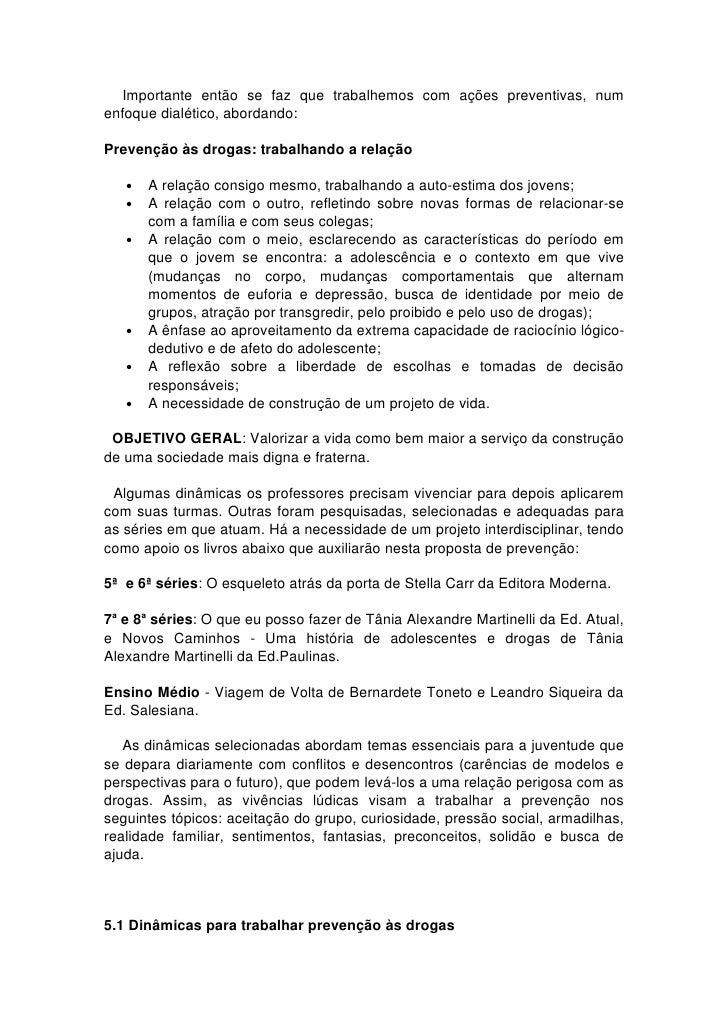 8. 8.      Importante   então   se   faz   que   trabalhemos   com   ações   preventivas,   num enfoque dialético, abordando:Prevenção às drogas: trabalhando a relação  • A relação consigo mesmo, trabalhando a auto­estima dos jovens;  • A relação com o outro, refletindo sobre novas formas de relacionar­se  com a família e com seus colegas;  • A relação com o meio, esclarecendo as características do período em  que   o   jovem   se   encontra:   a   adolescência   e   o   contexto   em   que   vive  (mudanças   no   corpo,   mudanças   comportamentais   que   alternam  momentos   de   euforia   e   depressão,   busca   de   identidade   por   meio   de  grupos, atração por transgredir, pelo proibido e pelo uso de drogas);  • A ênfase ao aproveitamento da extrema capacidade de raciocínio lógico­ dedutivo e de afeto do adolescente;  • A   reflexão   sobre   a   liberdade   de   escolhas   e   tomadas   de   decisão  responsáveis;  • A necessidade de construção de um projeto de vida.   OBJETIVO GERAL: Valorizar a vida como bem maior a serviço da construção de uma sociedade mais digna e fraterna.  Algumas dinâmicas os professores precisam vivenciar para depois aplicarem com suas turmas. Outras foram pesquisadas, selecionadas e adequadas para as séries em que atuam. Há a necessidade de um projeto interdisciplinar, tendo como apoio os livros abaixo que auxiliarão nesta proposta de prevenção: 5ª  e 6ª séries: O esqueleto atrás da porta de Stella Carr da Editora Moderna. 7a e 8a séries: O que eu posso fazer de Tânia Alexandre Martinelli da Ed. Atual, e   Novos   Caminhos   ­   Uma   história   de   adolescentes   e   drogas   de   Tânia Alexandre Martinelli da Ed.Paulinas.Ensino Médio ­ Viagem de Volta de Bernardete Toneto e Leandro Siqueira da Ed. Salesiana.     As dinâmicas selecionadas abordam temas essenciais para a juventude que se depara diariamente com conflitos e desencontros (carências de modelos e perspectivas para o futuro), que podem levá­los a uma relação perigosa com as drogas.   Assim,   as   vivências   lúdicas   visam   a   trabalhar   a   prevenção   nos seguintes tópicos: aceitação do grupo, curiosidade, pressão social, armadilhas, realidade   familiar,   sentimentos,   fantasias,   preconceitos,   solidão   e   busca   de ajuda.       5.1 Dinâmicas para trabalhar prevenção às drogas