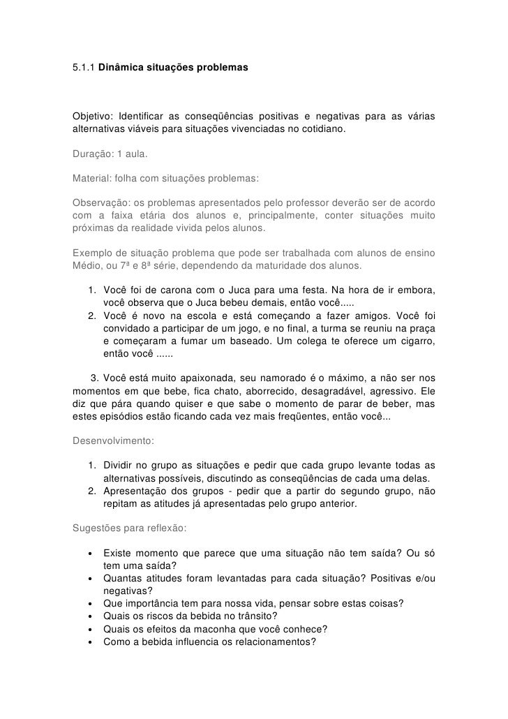 9. 9. 5.1.1 Dinâmica situações problemas  Objetivo:   Identificar   as   conseqüências   positivas   e   negativas   para   as   várias alternativas viáveis para situações vivenciadas no cotidiano. Duração: 1 aula. Material: folha com situações problemas:Observação: os problemas apresentados pelo professor deverão ser de acordo com   a   faixa   etária   dos   alunos   e,   principalmente,   conter   situações   muito próximas da realidade vivida pelos alunos.Exemplo de situação problema que pode ser trabalhada com alunos de ensino Médio, ou 7ª e 8ª série, dependendo da maturidade dos alunos.      1. Você foi de carona com o Juca para uma festa. Na hora de ir embora,  você observa que o Juca bebeu demais, então você.....  2. Você   é   novo   na   escola   e   está   começando   a   fazer   amigos.   Você   foi  convidado a participar de um jogo, e no final, a turma se reuniu na praça  e começaram a fumar um baseado. Um colega te oferece um cigarro,  então você ......       3. Você está muito apaixonada, seu namorado é o máximo, a não ser nos momentos em que bebe, fica chato, aborrecido, desagradável, agressivo. Ele diz que pára quando quiser e que sabe o momento de parar de beber, mas estes episódios estão ficando cada vez mais freqüentes, então você...Desenvolvimento:  1. Dividir no grupo as situações e pedir que cada grupo levante todas as  alternativas possíveis, discutindo as conseqüências de cada uma delas.  2. Apresentação dos grupos ­ pedir que a partir do segundo grupo, não  repitam as atitudes já apresentadas pelo grupo anterior. Sugestões para reflexão:  • Existe momento que parece que uma situação não tem saída? Ou só  tem uma saída?  • Quantas atitudes foram levantadas para cada situação? Positivas e/ou  negativas?  • Que importância tem para nossa vida, pensar sobre estas coisas?  • Quais os riscos da bebida no trânsito?  • Quais os efeitos da maconha que você conhece?  • Como a bebida influencia os relacionamentos?