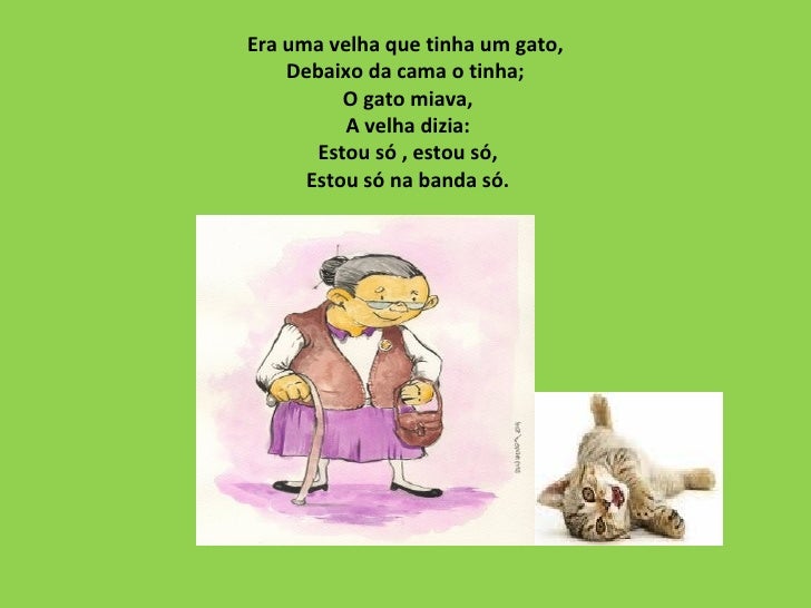 Era uma velha que tinha um gato,  Debaixo da cama o tinha;  O gato miava, A velha dizia: Estou só , estou só, Estou só na ...