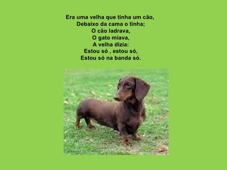 Era uma velha que tinha um cão,  Debaixo da cama o tinha; O cão ladrava,  O gato miava, A velha dizia: Estou só , estou só...