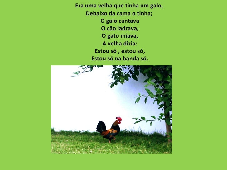Era uma velha que tinha um galo,  Debaixo da cama o tinha;  O galo cantava O cão ladrava, O gato miava, A velha dizia: Est...