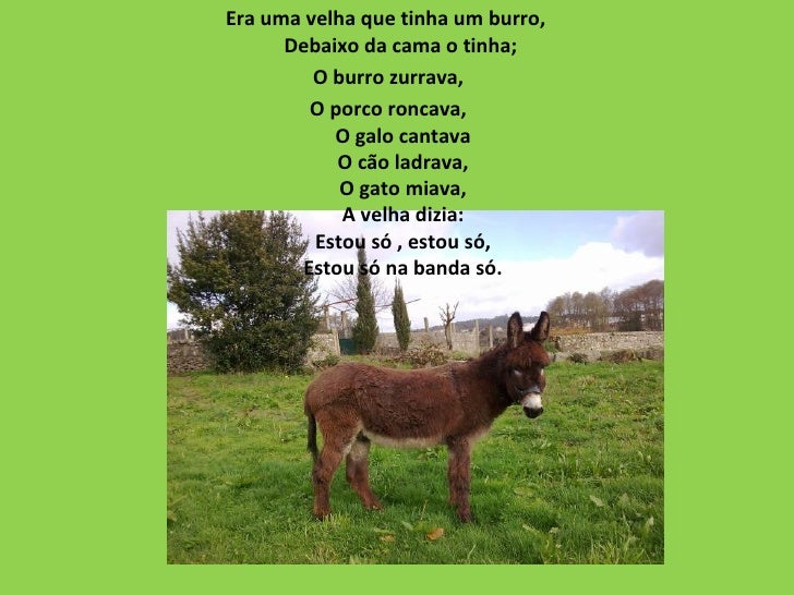 <ul><li>Era uma velha que tinha um burro,  Debaixo da cama o tinha;  </li></ul><ul><li>O burro zurrava, </li></ul><ul><li>...