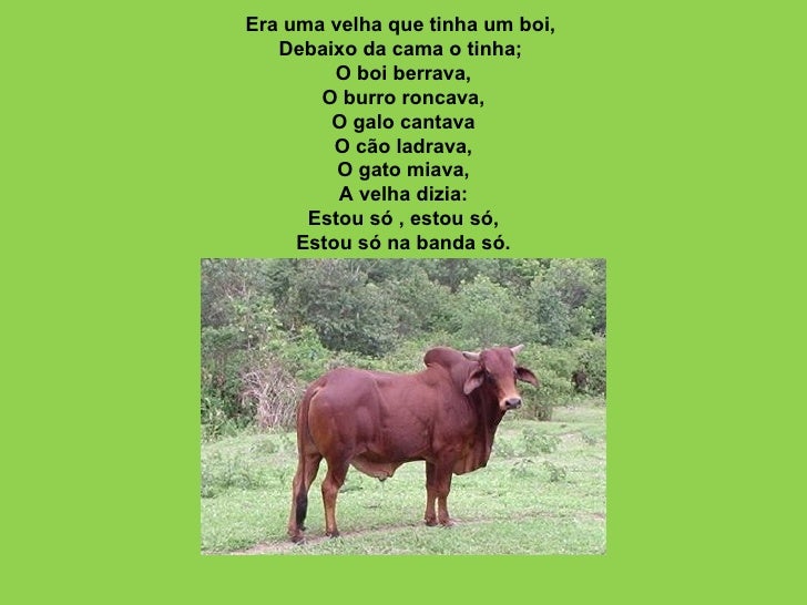 7. 7. Era uma velha que tinha um boi, Debaixo da cama o tinha; O boi berrava, O burro roncava, O galo cantava O cão ladrava, O gato miava, A velha dizia: Estou só , estou só, Estou só na banda só.