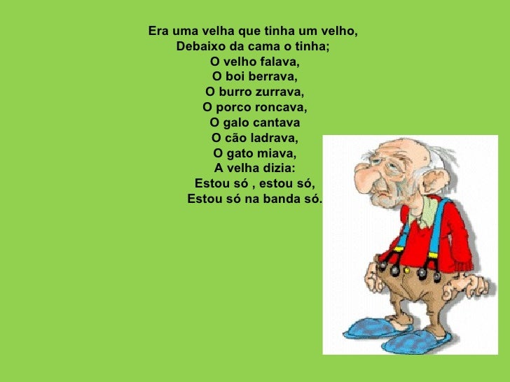 Era uma velha que tinha um velho,  Debaixo da cama o tinha;  O velho falava, O boi berrava, O burro zurrava, O porco ronca...