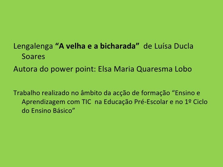 9. 9. <ul><li>Lengalenga “A velha e a bicharada” de Luísa Ducla Soares </li></ul><ul><li>Autora do power point: Elsa Maria Quaresma Lobo </li></ul><ul><li>Trabalho realizado no âmbito da acção de formação “Ensino e Aprendizagem com TIC na Educação Pré-Escolar e no 1º Ciclo do Ensino Básico” </li></ul>