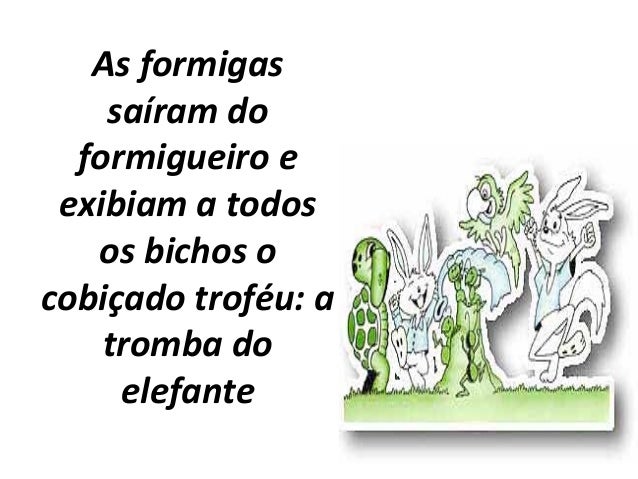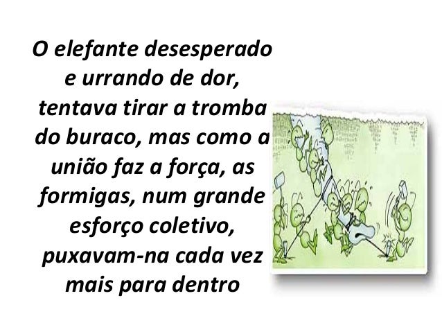 11. 11. O elefante desesperado e urrando de dor, tentava tirar a tromba do buraco, mas como a união faz a força, as formigas, num grande esforço coletivo, puxavam-na cada vez mais para dentro