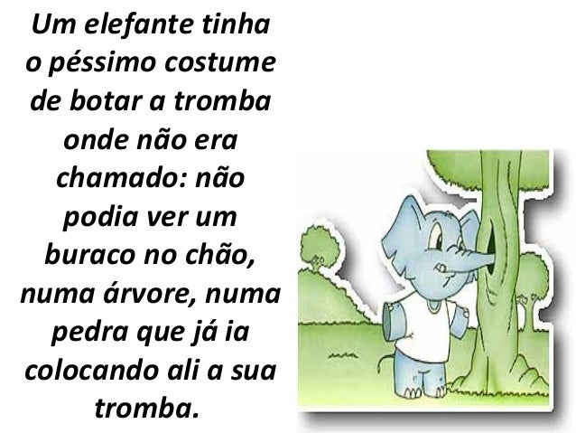 2. 2. Um elefante tinha o péssimo costume de botar a tromba onde não era chamado: não podia ver um buraco no chão, numa árvore, numa pedra que já ia colocando ali a sua tromba.