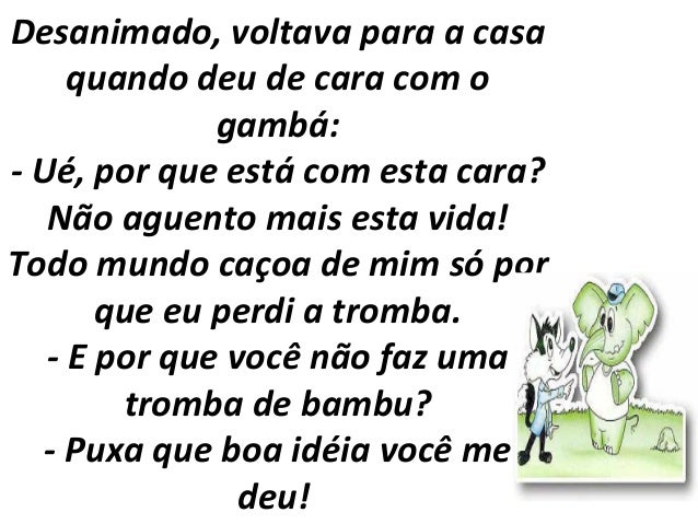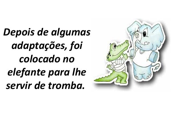 17. 17. E todo dia era a mesma história e o elefante, passando por tanta humilhação, foi ficando cada vez mais triste. Até que um dia, desabafou ao jacaré: - Não agüento mais essa vida! Além de ficar sem tromba, ainda tenho que agüentar gozações todos os dias. Se ao menos eu pudesse colocar uma tromba postiça...