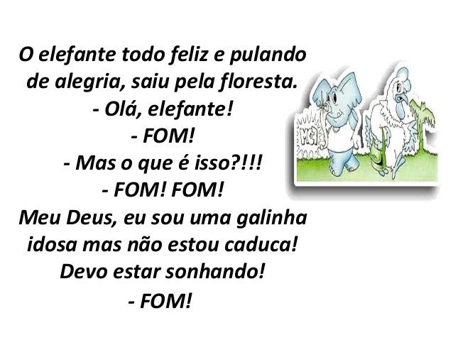21. 21. O elefante todo feliz e pulando de alegria, saiu pela floresta. - Olá, elefante! - FOM! - Mas o que é isso?!!! - FOM! FOM! Meu Deus, eu sou uma galinha idosa mas não estou caduca! Devo estar sonhando! - FOM!