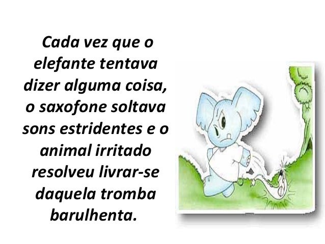22. 22. Cada vez que o elefante tentava dizer alguma coisa, o saxofone soltava sons estridentes e o animal irritado resolveu livrar-se daquela tromba barulhenta.