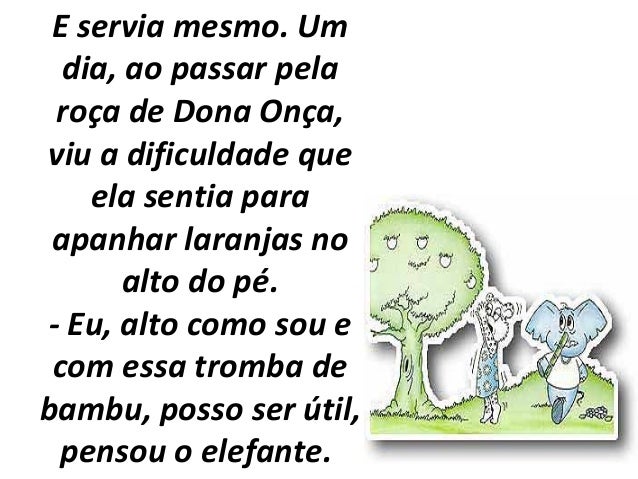 29. 29. E servia mesmo. Um dia, ao passar pela roça de Dona Onça, viu a dificuldade que ela sentia para apanhar laranjas no alto do pé. - Eu, alto como sou e com essa tromba de bambu, posso ser útil, pensou o elefante.