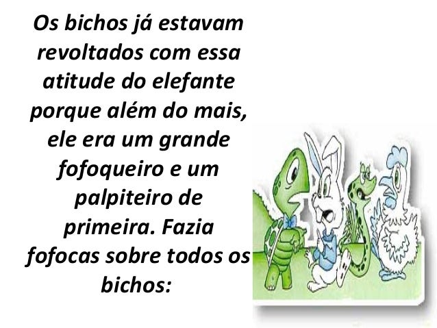 3. 3. Os bichos já estavam revoltados com essa atitude do elefante porque além do mais, ele era um grande fofoqueiro e um palpiteiro de primeira. Fazia fofocas sobre todos os bichos: