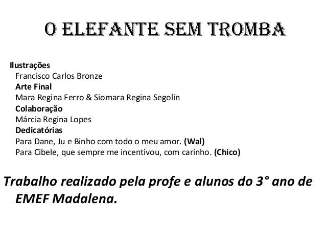 32. 32. O ELEFANTE SEM TROMBA Ilustrações Francisco Carlos Bronze Arte Final Mara Regina Ferro & Siomara Regina Segolin Colaboração Márcia Regina Lopes Dedicatórias Para Dane, Ju e Binho com todo o meu amor. (Wal) Para Cibele, que sempre me incentivou, com carinho. (Chico) Trabalho realizado pela profe e alunos do 3° ano de EMEF Madalena.