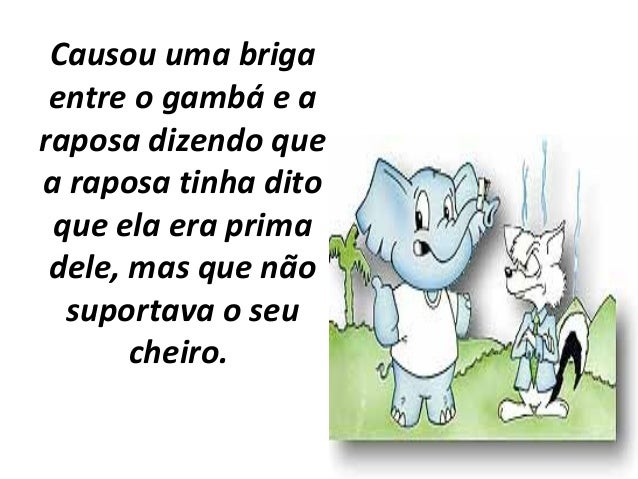 5. 5. Causou uma briga entre o gambá e a raposa dizendo que a raposa tinha dito que ela era prima dele, mas que não suportava o seu cheiro.
