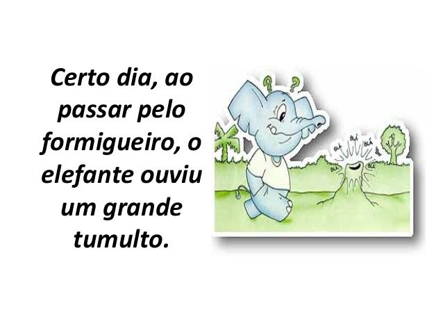 9. 9. Certo dia, ao passar pelo formigueiro, o elefante ouviu um grande tumulto.