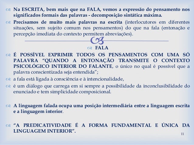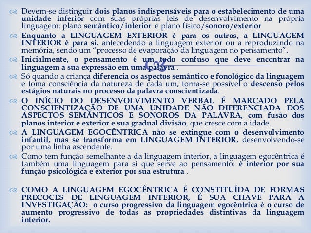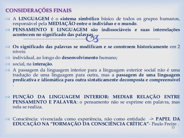 Tomando como referência o capítulo “Pensamento e palavra”, onde Vigotsky (2001) elucida a relação interior entre pensamento e palavra, considerando tanto a história da espécie humana como a do ser humano, até chegar a uma concepção de consciência sócio-histórica, discorremos sobre o desenvolvimento humano se dar nas trocas entre parceiros sociais, através de interação e mediação, onde a linguagem tem papel fundamental. Nessa abordagem sociointeracionista, a linguagem é antes de tudo social, funcionando como um instrumento complexo para viabilizar a comunicação e a vida em sociedade. Pensamento e palavra não revelam relação e dependência entre suas raízes genéticas, mas surgem e se constituem unicamente no processo do desenvolvimento histórico da consciência humana. De posse desse conceito de consciência, podemos intuir sobre o que os educadores poderiam fazer nas suas práticas profissionais.