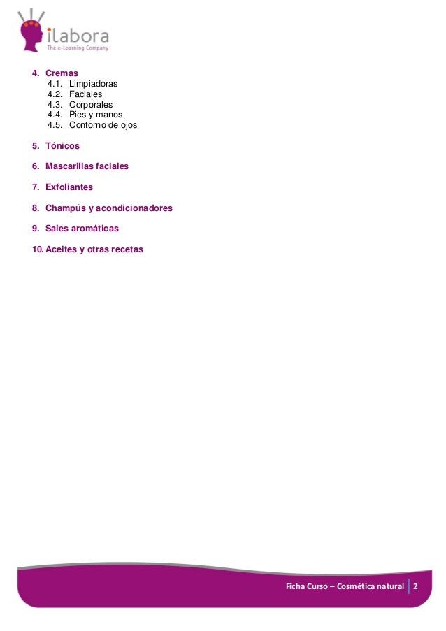 2. 2. 4. Cremas 4.1. Limpiadoras 4.2. Faciales 4.3. Corporales 4.4. Pies y manos 4.5. Contorno de ojos 5. Tónicos 6. Mascarillas faciales 7. Exfoliantes 8. Champús y acondicionadores 9. Sales aromáticas 10. Aceites y otras recetas Ficha Curso – Cosmética natural 2