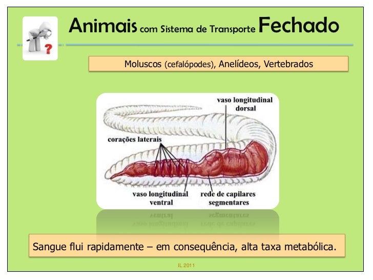10. 10. Animais com Sistema de Transporte Fechado Moluscos (cefalópodes), Anelídeos, VertebradosSangue flui rapidamente – em consequência, alta taxa metabólica. IL 2011