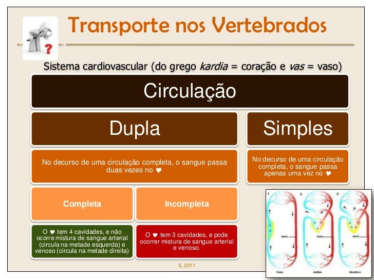 12. 12. Transporte nos Vertebrados Sistema cardiovascular (do grego kardia = coração e vas = vaso) Circulação Dupla Simples No decurso de uma circulação completa, o sangue passa No decurso de uma circulação completa, o sangue passa duas vezes no  apenas uma vez no  Completa Incompleta O  tem 4 cavidades, e não O  tem 3 cavidades, e podeocorre mistura de sangue arterial ocorrer mistura de sangue arterial (circula na metade esquerda) e e venoso.venoso (circula na metade direita) IL 2011
