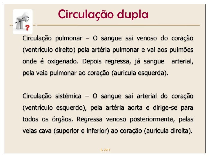 Circulação duplaCirculação pulmonar – O sangue sai venoso do coração(ventrículo direito) pela artéria pulmonar e vai aos p...