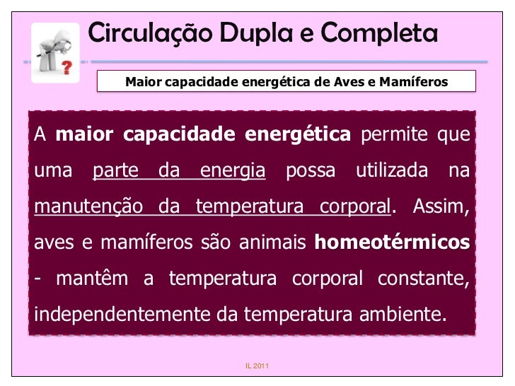 17. 17. Circulação Dupla e Completa Maior capacidade energética de Aves e MamíferosA maior capacidade energética permite queuma parte da energia possa utilizada namanutenção da temperatura corporal. Assim,aves e mamíferos são animais homeotérmicos- mantêm a temperatura corporal constante,independentemente da temperatura ambiente. IL 2011