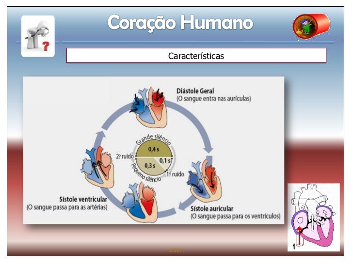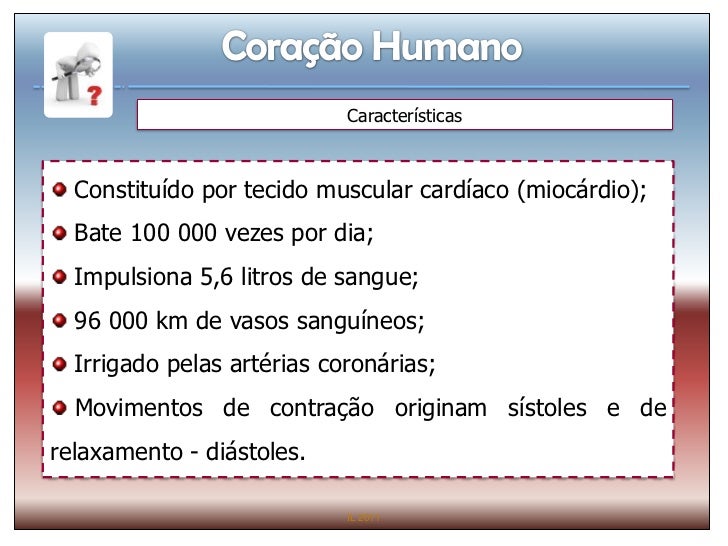 18. 18. Características Constituído por tecido muscular cardíaco (miocárdio); Bate 100 000 vezes por dia; Impulsiona 5,6 litros de sangue; 96 000 km de vasos sanguíneos; Irrigado pelas artérias coronárias; Movimentos de contração originam sístoles e derelaxamento - diástoles. IL 2011