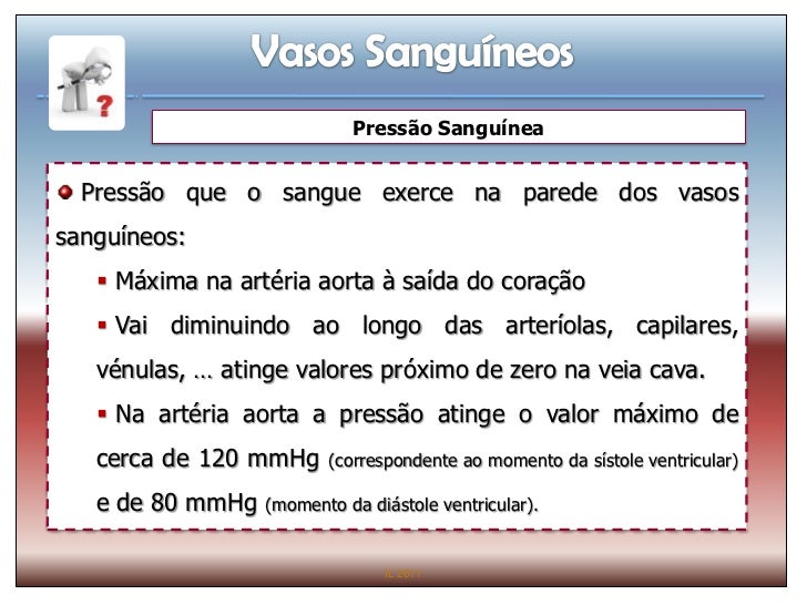 22. 22. Pressão Sanguínea Pressão que o sangue exerce na parede dos vasossanguíneos:  Máxima na artéria aorta à saída do coração  Vai diminuindo ao longo das arteríolas, capilares, vénulas, … atinge valores próximo de zero na veia cava.  Na artéria aorta a pressão atinge o valor máximo de cerca de 120 mmHg (correspondente ao momento da sístole ventricular) e de 80 mmHg (momento da diástole ventricular). IL 2011