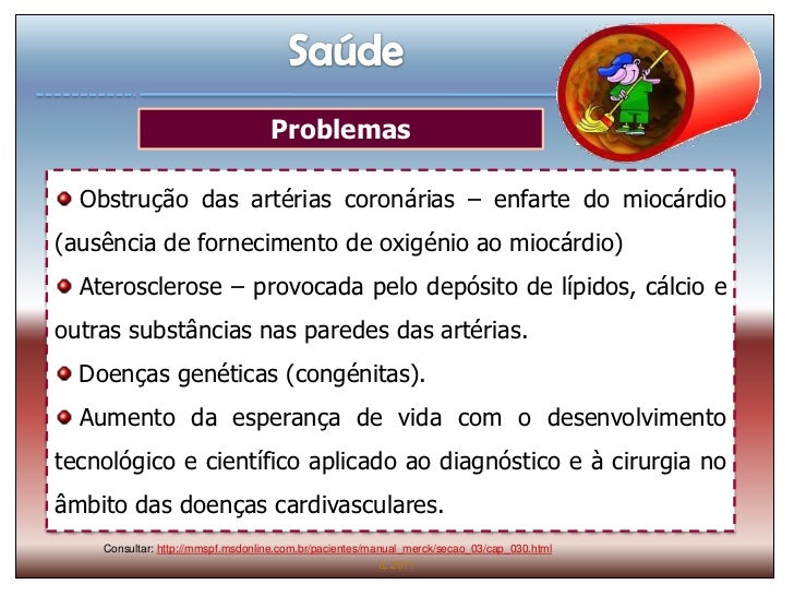 29. 29. Problemas Obstrução das artérias coronárias – enfarte do miocárdio(ausência de fornecimento de oxigénio ao miocárdio) Aterosclerose – provocada pelo depósito de lípidos, cálcio eoutras substâncias nas paredes das artérias. Doenças genéticas (congénitas). Aumento da esperança de vida com o desenvolvimentotecnológico e científico aplicado ao diagnóstico e à cirurgia noâmbito das doenças cardivasculares. Consultar: http://mmspf.msdonline.com.br/pacientes/manual_merck/secao_03/cap_030.html IL 2011