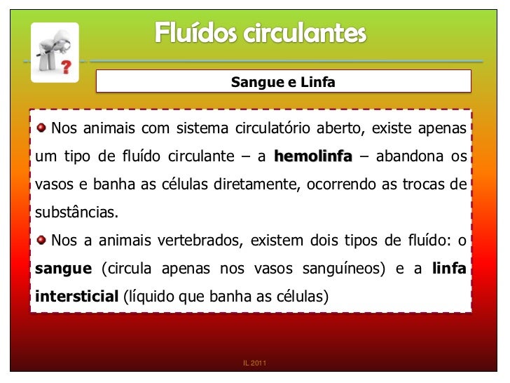 30. 30. Sangue e Linfa Nos animais com sistema circulatório aberto, existe apenasum tipo de fluído circulante – a hemolinfa – abandona osvasos e banha as células diretamente, ocorrendo as trocas desubstâncias. Nos a animais vertebrados, existem dois tipos de fluído: osangue (circula apenas nos vasos sanguíneos) e a linfaintersticial (líquido que banha as células) IL 2011