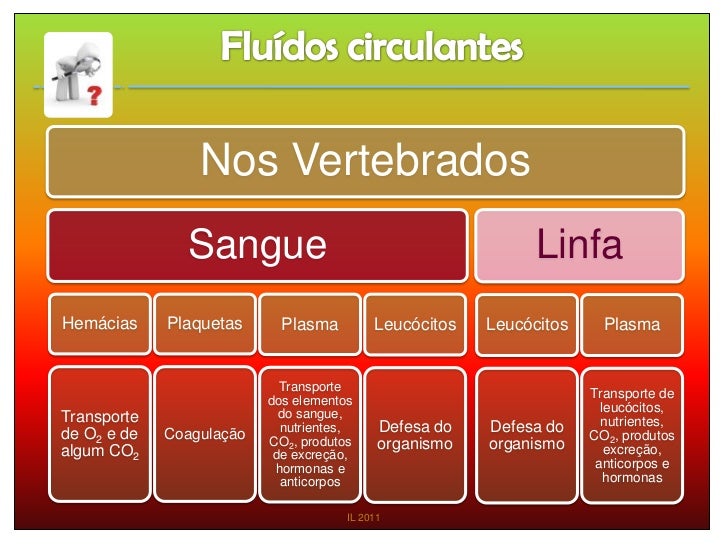 Nos Vertebrados               Sangue                                         LinfaHemácias     Plaquetas      Plasma      ...