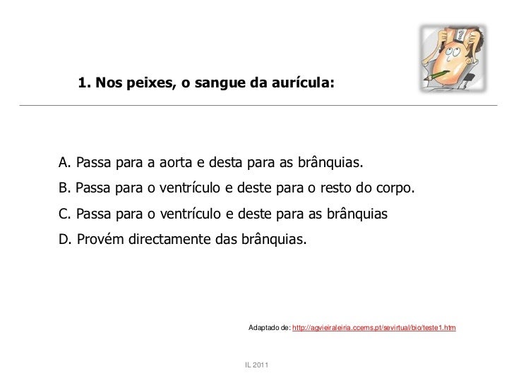 39. 39. 1. Nos peixes, o sangue da aurícula:A. Passa para a aorta e desta para as brânquias.B. Passa para o ventrículo e deste para o resto do corpo.C. Passa para o ventrículo e deste para as brânquiasD. Provém directamente das brânquias. Adaptado de: http://agvieiraleiria.ccems.pt/sevirtual/bio/teste1.htm IL 2011