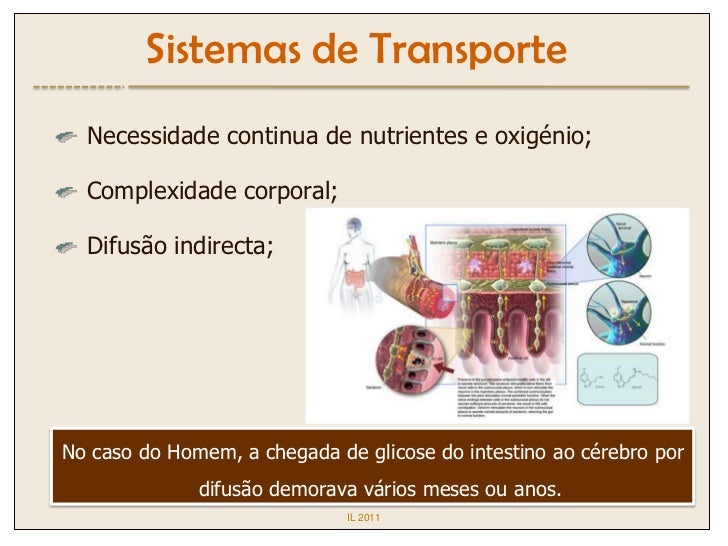 4. 4. Sistemas de Transporte Necessidade continua de nutrientes e oxigénio; Complexidade corporal; Difusão indirecta;No caso do Homem, a chegada de glicose do intestino ao cérebro por difusão demorava vários meses ou anos. IL 2011