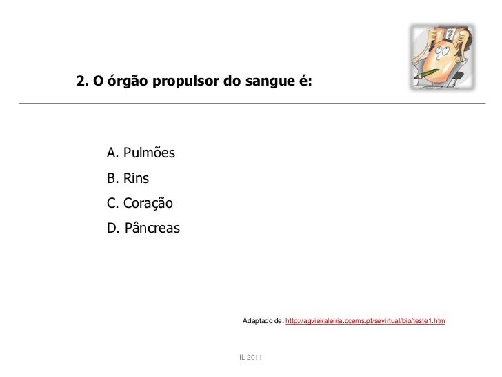 2. O órgão propulsor do sangue é:    A. Pulmões    B. Rins    C. Coração    D. Pâncreas                       Adaptado de:...