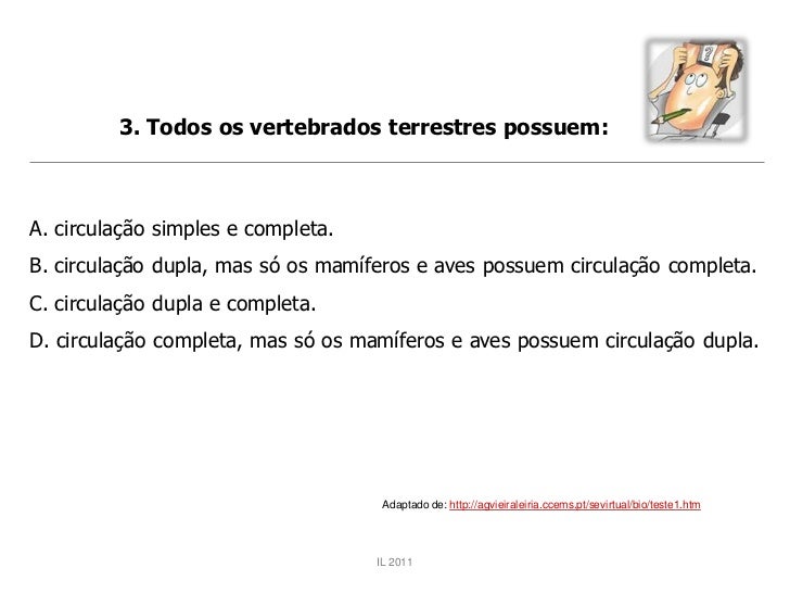 41. 41. 3. Todos os vertebrados terrestres possuem:A. circulação simples e completa.B. circulação dupla, mas só os mamíferos e aves possuem circulação completa.C. circulação dupla e completa.D. circulação completa, mas só os mamíferos e aves possuem circulação dupla. Adaptado de: http://agvieiraleiria.ccems.pt/sevirtual/bio/teste1.htm IL 2011