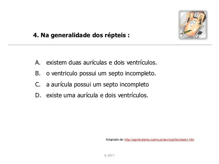 42. 42. 4. Na generalidade dos répteis :A. existem duas aurículas e dois ventrículos.B. o ventriculo possui um septo incompleto.C. a aurícula possui um septo incompletoD. existe uma aurícula e dois ventrículos. Adaptado de: http://agvieiraleiria.ccems.pt/sevirtual/bio/teste1.htm IL 2011