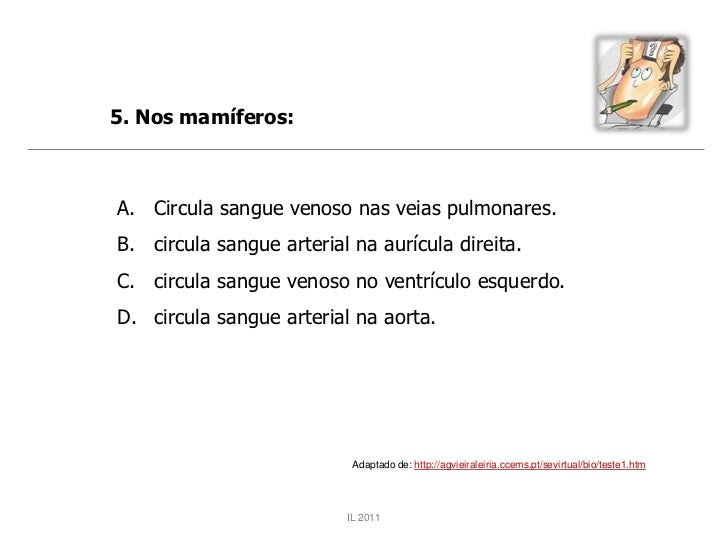 43. 43. 5. Nos mamíferos:A. Circula sangue venoso nas veias pulmonares.B. circula sangue arterial na aurícula direita.C. circula sangue venoso no ventrículo esquerdo.D. circula sangue arterial na aorta. Adaptado de: http://agvieiraleiria.ccems.pt/sevirtual/bio/teste1.htm IL 2011