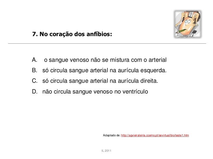 45. 45. 7. No coração dos anfíbios:A. o sangue venoso não se mistura com o arterialB. só circula sangue arterial na aurícula esquerda.C. só circula sangue arterial na aurícula direita.D. não circula sangue venoso no ventrículo Adaptado de: http://agvieiraleiria.ccems.pt/sevirtual/bio/teste1.htm IL 2011