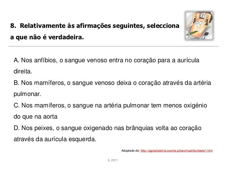 46. 46. 8. Relativamente às afirmações seguintes, seleccionaa que não é verdadeira. A. Nos anfíbios, o sangue venoso entra no coração para a aurícula direita. B. Nos mamíferos, o sangue venoso deixa o coração através da artéria pulmonar. C. Nos mamíferos, o sangue na artéria pulmonar tem menos oxigénio do que na aorta D. Nos peixes, o sangue oxigenado nas brânquias volta ao coração através da aurícula esquerda. Adaptado de: http://agvieiraleiria.ccems.pt/sevirtual/bio/teste1.htm IL 2011